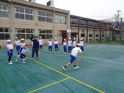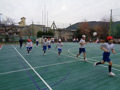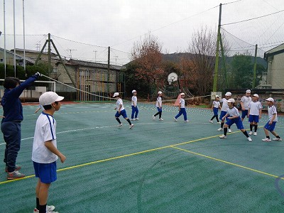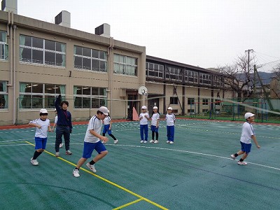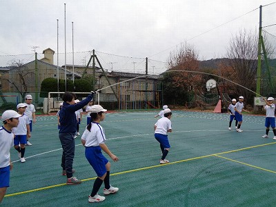 小学校グランドを走ったあと、二手に分かれて大縄とびです。