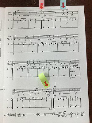 青い付せん矢印のところからです。「」と記していますね。その一拍(いっぱく)前からスタートするのが、この曲の特徴(とくちょう)です。