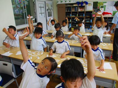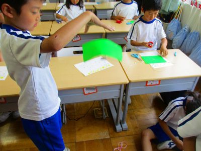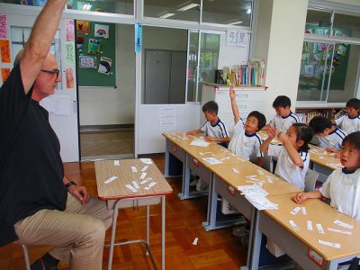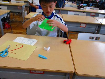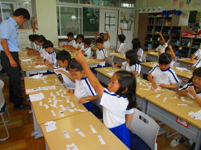 「教室にあるもの」を発声しながら、先週切り分けたカードを取り上げているところです。