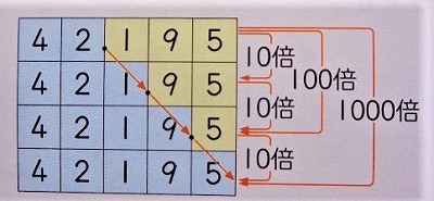 整数や小数を、10倍、100倍、1000倍すると、小数点は、右にそれぞれ1けた、2けた、3けた移ります。