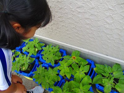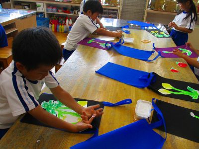先週の図工の時間に作った“絵”を、衣装に付けているところです。