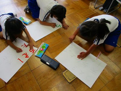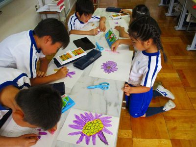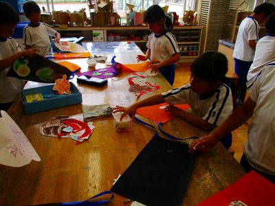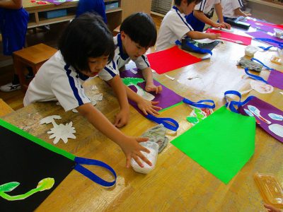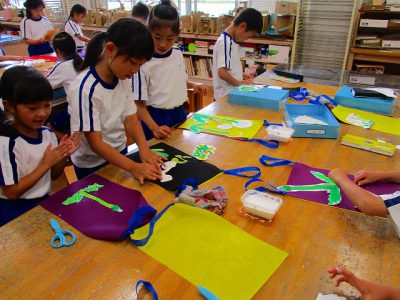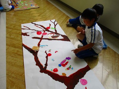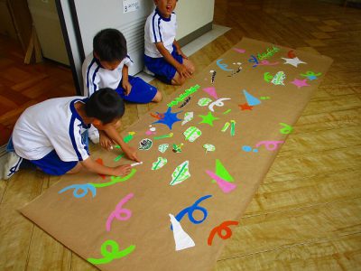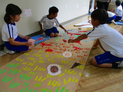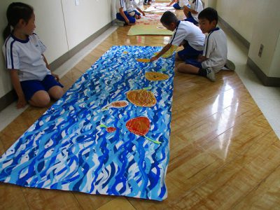 作業が早く済んだみんなは、倉掛先生が準備された大きな台紙に、背景用の“絵”を貼ってくれています。
