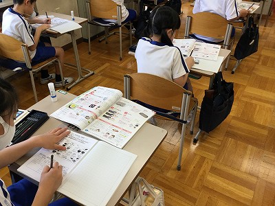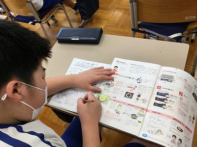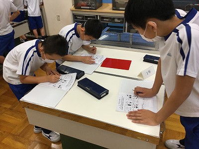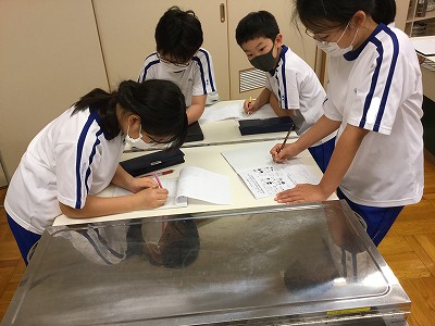 ノートに、探検の気づきや感想を書く時間です。「はじめて聞く名前の物を見て、早く使ってみたいと思いました」と知らせてくれました。また、「さいばしでも、玉じゃくしでも…一つの種類につき、量が多かった」と、わが家とは違う驚きも聞かせてくれました。調理関係の実習が、さらに、待ち遠しくなりますね。
