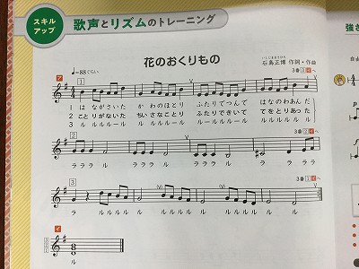 斉唱のあとは、“輪唱”にチャレンジしました。「♪花のおくりもの」は、やさしいメロディが流れるようにつながります。1,2,3のメロディが重なると、美しいハーモニーが生まれます。