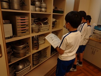 また、計量カップやフライパン、鍋の種類など、家庭科室内の用具調べも並行して行いました。
