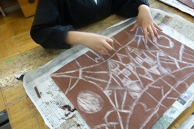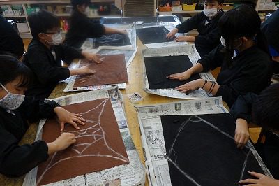1・2校時は図画工作の学習です。先週,真っ黒,または真っ茶色にコンテをすり込んだ画面に消しゴムを使って絵に表していく「消してかく」の学習です。