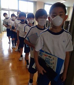 理科教室へ行くところです。密に気をつけて並ぶのは難しいですね。