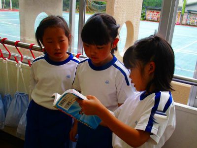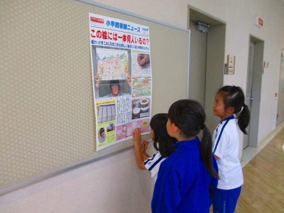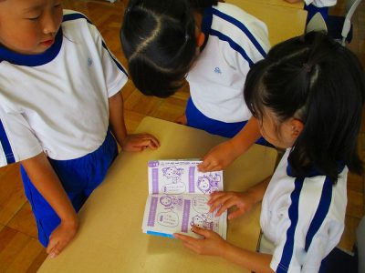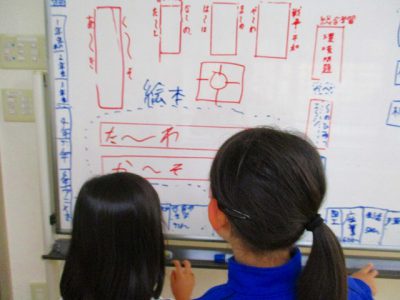 こちらは、「なぞなぞクイズ」の練習、真っ最中!給食時間に向けて、問題選びとクイズの出し方を打ち合わせしています。