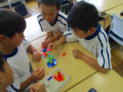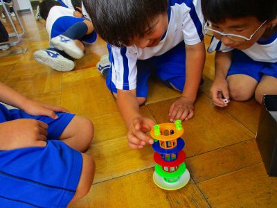 最後は、教室にて。数年前のバザーでいただいた“ミニおもちゃ”を出して(雨の日限定)遊ぶ、算数セットの双六で遊ぶ…