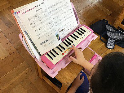 「♪こきょうの人々」の低音パートを鍵盤ハーモニカで確かめています。今日は、友達の歌声に合わせて、低音の音を重ね、そのひびきを感じ取ることが目当てです。