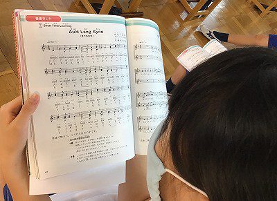 後半の学習は、英語表記の曲目を紹介しました。このページを開く前に「この音楽を聞いてみましょう。もしかすると、前奏から『何の歌か?』分かるかも…」と、始めました。スコットランドで生まれた『ほたるの光』の原曲です。すぐに、「あっほたるの光!」と言い当ててくれたみんなと、英語での歌唱に耳を傾け、口ずさみました。
