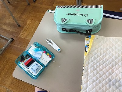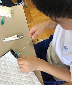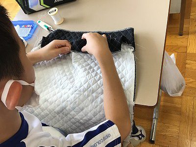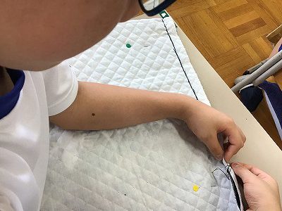 金曜日に続き、今日は“ひも通し”の部分を縫う時間を過ごしました。