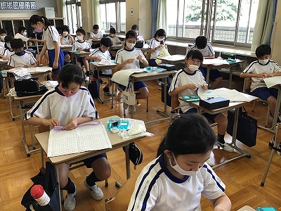 「ナップザック作り」に取り組んでいます。1学期からの続きなので、5年キッズは自分の進み具合を覚えているでしょうか???