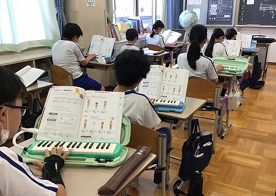 こちらは「♪星笛」の二重奏を練習しています。このあと、メロディと下のパートに分かれ、ゆっくりと合わせる学習に取り組みました。