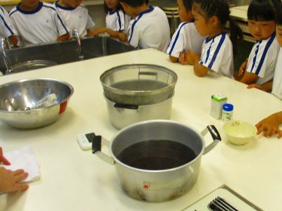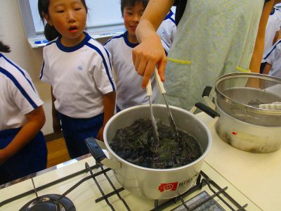 このあと、給食の居相先生が葉を水洗いし、茹でる作業をして下さいます。近くでそのようすを見学するため、算数は家庭科室の隣、「和の部屋」で行いました。
