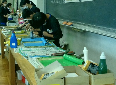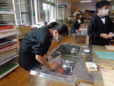 今日は、多くの人が刷りに入りました。二度目の刷りは版木を彫り進めてから、 違う色で刷っていました。