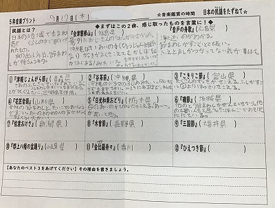 題名と、その民謡が歌い継がれている都道府県を書き残し、5年生自身が抱いた印象や聞き取った楽器の音色などを文章に表しています。