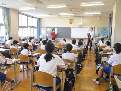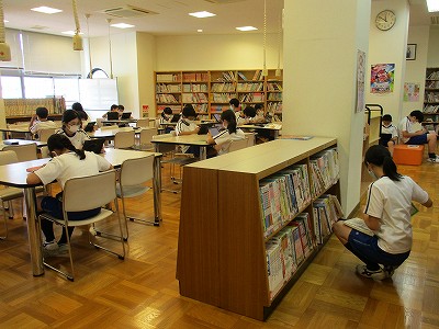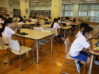 総合の時間。今日は「環境問題調べ」を図書館で行いました。インターネットと本の両方で、それぞれの特長を生かしながら調べ学習を進めていました。