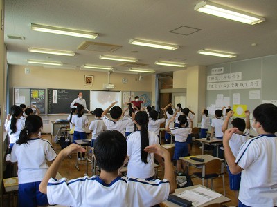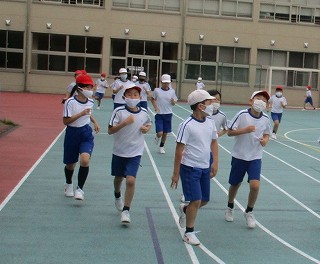 朝根っこマラソンの時間です。今日は、小学校の運動場で朝のマラソンをしました。5年生と2年生が同時に走るので、5年生はトラックの外側を走りました。涼しくなってきたのでとても走りやすくなりました。