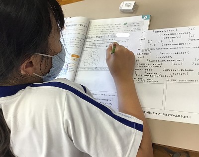 「お金以外の支払い方法」を学習するときには、自分の生活に照らし合わせて考える姿が見られました。大切な「収入」を計画的に「支出」し、つり合いを保ちつつ生活していることを知った上で、日々の買い物が成立することに気づいてくれることを願います。