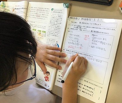今日は、「買い物の仕方」について考え、教科書の大事な内容を書きとめたり、資料から分かることを自分の言葉でまとめたりする学習に取り組みました。