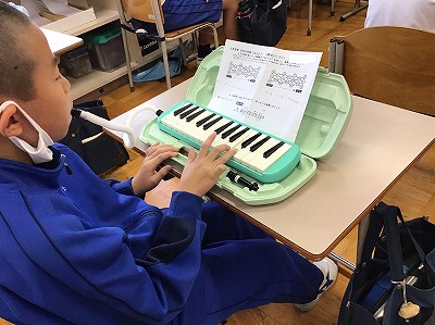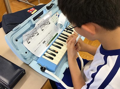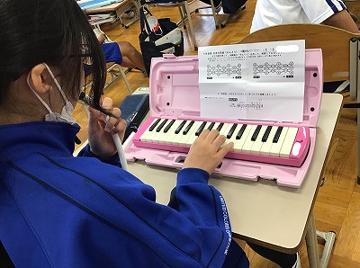 教室に戻り、「沖縄風の旋律づくり」の続きを行いました。自分が考えたメロディの練習をした後に、座席順に一人ずつ演奏してもらいました。