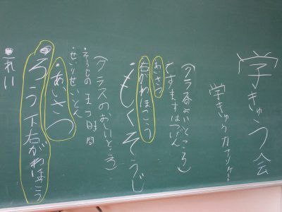 議長団の議事進行(!?)のもと、「クラスのよいところ・おしいところ」について、意見を出してもらっています。