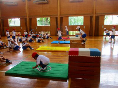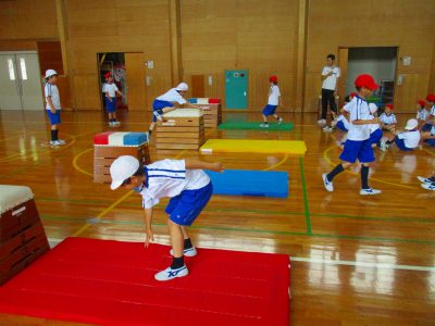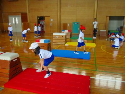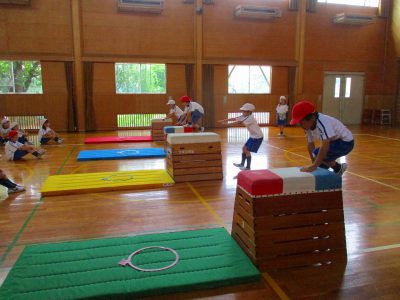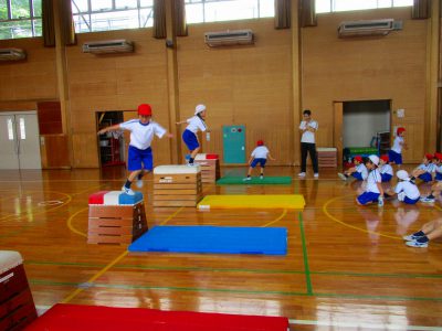 段の高さが違う2種類の跳び箱に跳び乗って、ふんわりと着地することからスタートです。もちろん、高さ違いの段にも挑戦します。