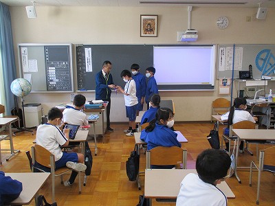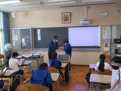 給食の時間ですが、児童会本部役員が球技大会の賞状とホームラン賞のメダルを届けてくれました。