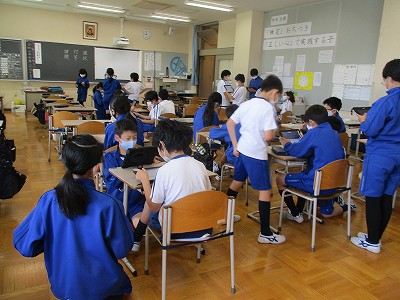 学級活動の時間は、環境問題について、これまで調べてきた事の中から何を発表しようかと、発表グループに分かれて話し合いました。