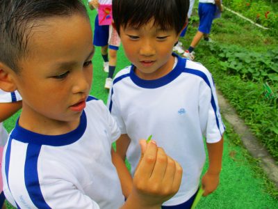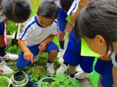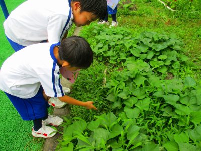 雨が上がった5校時、お手製の『草花・生き物マップ』を持って、1年生と校庭を探検する学習を行いました。花壇のサツマイモやカタバミ、オジギソウを紹介しようと、はりきっています。