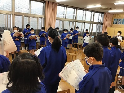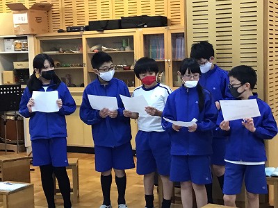 進み具合を知らせてくれるグループが多い中、「始めの部分だけやってみます!」というグループの中間発表を聞き合いました。声の高さや、強さ、どこで発するかなど、相談したところまでを披露してくれました。