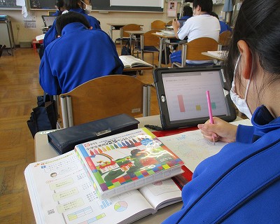 12/9水【即座にグラフ化できて(算数)】 文教小ニュース 2020/12/09 【算数】 算数の時間です。 ロイロノートのアンケート機能を使ってアンケートを行い、集計の結果をノートに割合のグラフで表しました。 自分の関心事が、即座にグラフ化できるので、とても楽しい授業になりました。 ←前の記事 文教小ニュースの一覧 次の記事→ 文教トピックス 学年だより1年 学年だより2年 学年だより3年 学年だより4年 学年だより5年 学年だより6年 一覧はコチラ カテゴリー 文教小ニュース (984) お知らせ (981) イベント (2) 入試関連 (1) 文教トピックス (29) 学年だより1年 (150) 学年だより2年 (149) 学年だより3年 (150) 学年だより4年 (153) 学年だより5年 (200) 学年だより6年 (200) 2022年度 (429) 文教トピックス (216) 学年だより1年 (49) 学年だより2年 (50) 学年だより3年 (49) 学年だより4年 (50) 学年だより5年 (7) 学年だより6年 (8) 2021年度 (1,116) 文教トピックス (217) 学年だより1年 (177) 学年だより2年 (177) 学年だより3年 (177) 学年だより4年 (181) 学年だより5年 (187) 2020年度 (1,072) 文教トピックス (249) 学年だより1年 (206) 学年だより2年 (206) 学年だより3年 (205) 学年だより4年 (206) 2019年度 (681) 文教トピックス (200) 学年だより1年 (160) 学年だより2年 (160) 学年だより3年 (161) 2018年度 (569) 文教トピックス (213) 学年だより1年 (178) 学年だより2年 (178) 2017年度 (418) 文教トピックス (225) 学年だより1年 (193)