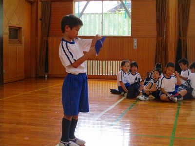 結び方が分からない1年生に教えてあげる2年生、ありがとう!