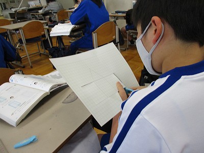 今日は、工作用紙に三角柱の展開図をかいて組み立てる学習をしました。