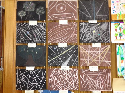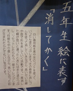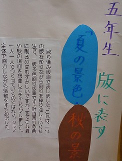 今回、図工の展示では、彫り進み版画「夏の景色・秋の景色」とコンテを使った絵「消してかく」を展示しました。