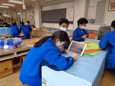 中間休みや昼休みには、「6年生ありがとうの会」の準備をする姿が、学内のあちこちで見られます。入退場門の制作をしている5年生もがんばっています。