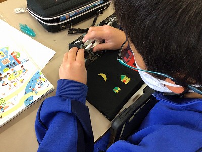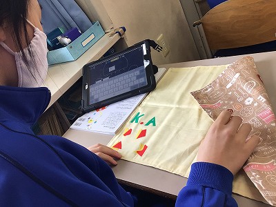 今日は、自分の作品を手に取り、「糸の始末」や「ミシンの縫い方・使い方」「アプリケの工夫や道具・用具の扱い」などに注目して、活動の振り返りを行いました。