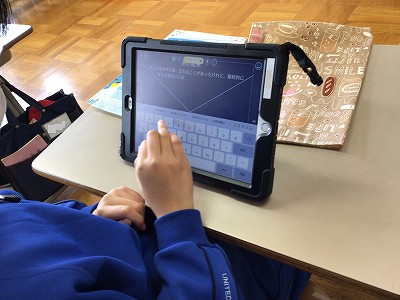 返し縫いで少しずれてしまうことや、“表返し”をしたあとのマットの端ぎりぎりを縫う作業などを思い出し、「できるようになったこと・反省点や課題」をロイロノートに打ち込んでいきます。