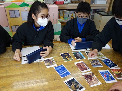 今日は、13枚の図版を使って、同じ作者の作品を形や色、構図や材料の違いなどの造形要素に着目して、同じ作者の作品を見つけていくルールにしました。