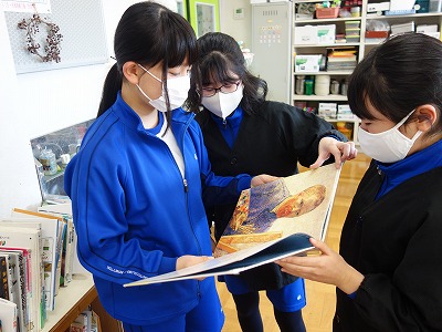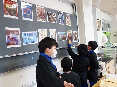 おどろいたことに、途中の「トイレ休憩」の際にも、黒板に掲示していた大きな図版を見ながら議論していたり、造形室にある鑑賞用の絵本で確認したりしている姿も見られました。