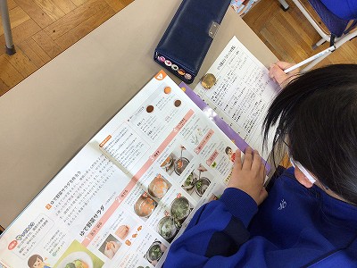 野菜はスティック状に切って、ゆでたものを盛り付ける作業が待っています。その中で、節水や節ガス、洗い物を少なくする、などのeco(環境)に注意した取り組みになるよう、自分の言葉でプリントに記入しています。「皮をむかずに、調理する」や「へたを残しておいて、葉の部分を育てて再利用する」など、“マイエコ”を発言していました。