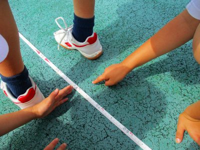 1mものさしや、メジャーの目盛りを見て、仲間に跳んだ幅の長さを伝えています。