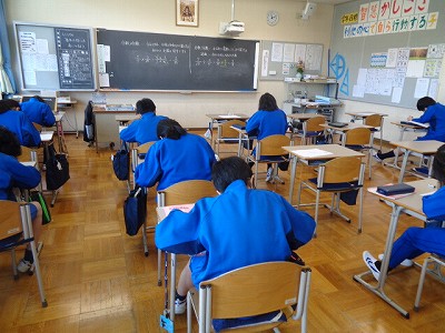 6年教室の玉井先生のクラスでは、新しい単元「分数の計算」に入りました。プリントを使って学習を進めています。
