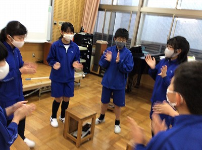 後半は、言葉を使ったリズム学習です。教科書には「スポーツ」をテーマにした言葉でリズム合わせを紹介しています。私たちも、いくつかのバリエーションを相談して、リズム合わせを楽しみました。