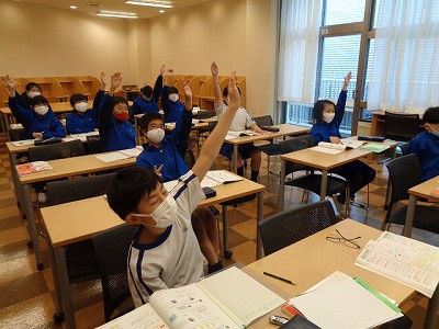 3時間目は、算数。6年生教室では、昨日から「分数の計算」に入っています。プリントを使って進めていますが、計算問題は四則計算があり、文章問題も難易度の高い問題を含んでいます。分からない問題は、玉井先生に積極的に質問しています。
