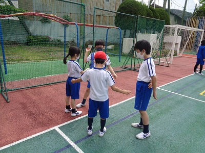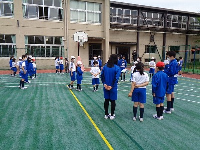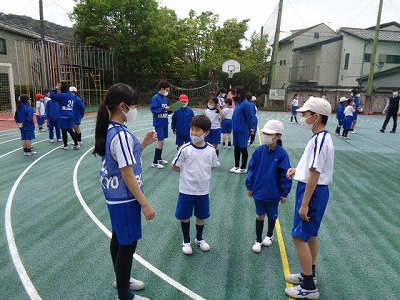 集会の前に各れんげ班に分かれて、自己紹介や「結束のパフォーマンス」の打ち合わせです。