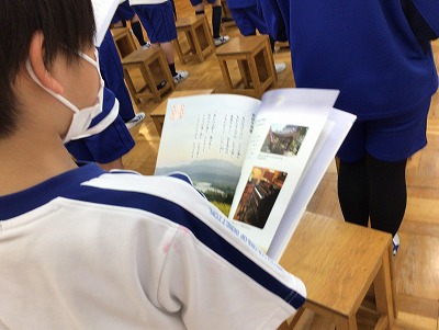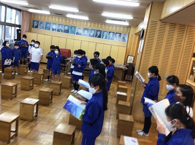 「♪おぼろ月夜」の歌唱練習も行いました。作者・高野辰之が、故郷長野の冬が終わり、菜の花一面の春を思って作詞したと言われています。大正の時代から歌い継がれている曲です。もう少し学習を進め、家で口ずさんでほしいです。ご家族で唱和できますね。