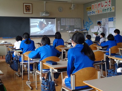 今日の「交通安全教室」は、自転車の安全な乗り方について、川端署の警察の方にくわしく教えていただきました。