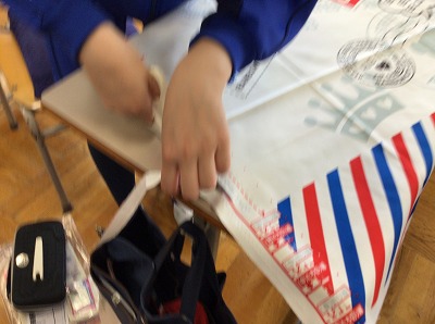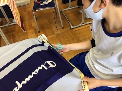 仮縫い用の“しつけ糸”を受け取ったら、“ざっくり波縫い”の開始です。5年生の時に実習した“返し縫い”や“本返し縫い”ではなく、“ざっくり波縫い”で進むので、あっという間に縫えてしまします。
